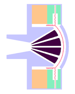 • à ogive : ce type de tweeter comporte une ogive centrale et une membrane annulaire. Très souvent il est associé à un pavillon, plus ou moins développé, pour améliorer son efficacité. Ce type de tweeter offre généralement une efficacité assez élevée.