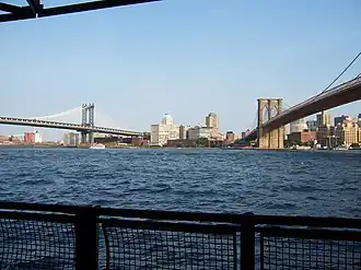 - (en) Cet article est partiellement ou en totalité issu de l’article de Wikipédia en anglais intitulé « Two Bridges, Manhattan » (voir la liste des auteurs).