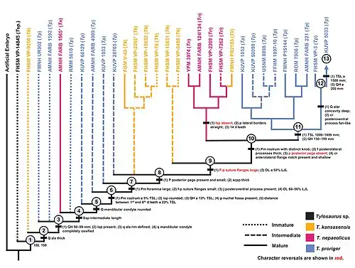 Dans la voie maritime intérieure de l'Ouest, T. nepaeolicus et T. proriger, peuvent représenter une chrono-espèce, dans laquelle ils constituent une seule lignée qui évolua continuellement sans ramification dans un processus connu sous le nom d'anagenèse. Cela est évident par le fait que les deux espèces ne se chevauchent pas stratigraphiquement, sont des taxons frères, partagent des différences morphologiques mineures et intermédiaires telles qu'un changement progressif dans le développement de l'os carré et vivaient aux mêmes endroits[45],[49]. Une hypothèse émet que les moyens par lesquels cette lignée évolua reposent sur l'un des deux mécanismes évolutifs liés aux changements dans l'ontogenèse. Premièrement, Jiménez-Huidobro, Simões et Caldwell proposent en 2016 que T. proriger ait évolué comme un pédomorphe de T. nepaeolicus, dans lequel le descendant est né de changements morphologiques dus à la rétention des caractéristiques juvéniles du taxon ancestral à l'âge adulte. Ceci est basé sur la présence d'une crête frontale et de bords convexes de l'os pariétal du crâne partagés chez les juvéniles de T. nepaeolicus et tous les individus de T. proriger, mais perdus chez les adultes de T. nepaeolicus[47],[49]. Cependant, une étude ontogénétique réalisée par Amelia R. Zietlow en 2020 révèle qu'il n'est pas clair si cette observation résulte d'une pédomorphose, bien que cette incertitude puisse être due au fait que la taille de l'échantillon des T. nepaeolicus adultes est trop faible pour déterminer la signification statistique. Deuxièmement, la même étude propose une hypothèse alternative de péramorphose, dans laquelle T. proriger aurait évolué en développant des traits trouvés chez les T. nepaeolicus matures au cours de l'immaturité. Basée sur les résultats d'un ontogramme cladistique développé à partir des données de 74 spécimens de Tylosaurus, l'étude identifie une multitude de traits présents chez tous les spécimens de T. proriger et des T. nepaeolicus adultes, mais absents chez les juvéniles de cette dernière espèce : la taille et la profondeur du crâne sont grandes, la longueur du rostre allongé dépasse 5 % de la longueur crânienne totale, les processus suprastapédiens carrés sont épais, la forme globale du carré converge et le processus postéroventral ressemble à un éventail[49].