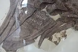 - 1 2 3 (en) Michael W. Caldwell et Cristiano Dal Sasso, « Soft-tissue preservation in a 95 million year old marine lizard: form, function, and aquatic adaptation », Journal of Vertebrate Paleontology, vol. 24, no 4, , p. 980-985 (DOI 10.1671/0272-4634(2004)024[0980:spiamy]2.0.co;2, JSTOR 4524795, S2CID 85605603, lire en ligne)