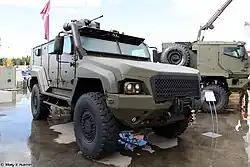 - K-4386 Typhoon-VDV - Véhicule 2 essieux en service pour les troupes aéroportées russes et disponible à l'exportation depuis 2021[9],[10],[11]. Le véhicule d'escorte et de contrôle Naparnik a été développé sur sa base et adopté en septembre 2021[12]. Il a 350 chevaux, peut atteindre la vitesse de 105 km/h sur route, et peut être transporté par l'Il-76, l'An-124 ou le Mi-26. Le véhicule est équipé de capteurs thermiques, d'une variété de mitrailleuses de calibres (7,62 mm et 12,7 mm) et embarque une tourelle téléopérée (RWS). Le RWS peut être équipé d'un canon 2A42 de calibre 30 mm, d'un lance-grenades AGS-30 et d'une mitrailleuse PKTM 7,62 mm. Le blindage est comparable au stanag 3 de l'OTAN[13].