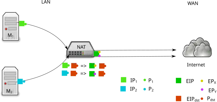 Le NAT permet aux machines d'un réseau privé d'établir des connexions sortantes vers Internet avec une seule adresse IP publique, l'adresse de la machine NAT. Pour ce faire le NAT va maintenir un suivi des connexions démarrées par les machines du réseau privé et au tuple d'adresses IP et de port réseau, source puis destination, (IP1, P1, IPdst, Pdst) va faire correspondre le tuple (EIP, EPX, IPdst, Pdst).
