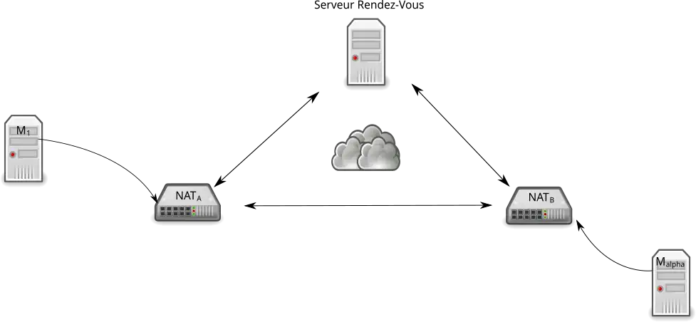 - 10. Ainsi, des trous ont été créés dans les NAT, les deux hôtes peuvent communiquer directement. Dans le pire des cas, le second paquet de M1 atteint Malpha et le second paquet de Malpha atteint M1.