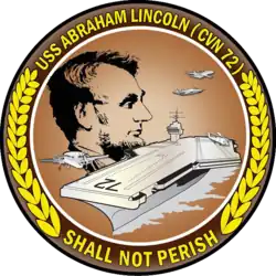 Il est le second navire à avoir été nommé d'après le nom de l'ancien président des États-Unis Abraham Lincoln. Sa devise officielle, « Shall not perish » (« Ne périra pas »), provient du discours d'inauguration du cimetière de Gettysburg d'Abraham Lincoln[2]. La devise non officielle, quant à elle, date de décembre 2002 et provient du capitaine du navire, qui devait ce jour-là annoncer à son équipage que la durée du déploiement serait arbitrairement prolongée de trois mois. Devant le mécontentement général, il aura comme seule réponse l'ironique formule « Get over it! » (« vous vous en remettrez ! »). Cette formule fut source de moquerie de la part des membres d'équipage, qui l'utilisèrent à l'époque pour se railler entre eux[3].