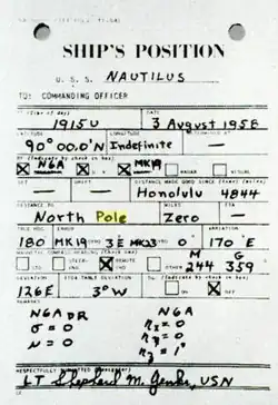 La navigation se fit en suivant les reliefs du fond marin grâce aux cartes bathymétriques disponibles, bien que la précision de la position ne dépassât pas 0,3 mille nautique. En atteignant le méridien 155° ouest, le Nautilus mit le cap plein nord, pénétrant dans des eaux encore inexplorées. L’absence de cartes précises rendait la navigation complexe, reposant uniquement sur le gyrocompas et l’estimation de la distance parcourue. Cependant, à des latitudes proches du pôle, le gyrocompas Mark 19 perdit sa capacité à indiquer le nord en raison de la diminution de l’effet de rotation terrestre sur le gyroscope[8]. Pour maintenir la navigation, l'équipage a utilisé un gyrocompas secondaire en mode directionnel libre, en estimant la dérive constatée auparavant[8]. Cette méthode a permis d'effectuer des relevés précis jusqu'au pôle Nord, facilitant les corrections de cap lors de l'approche finale. L'utilisation d'un système de coordonnées géographiques classiques aurait entraîné des erreurs à proximité du pôle. Pour éviter ces imprécisions, la navigation du sous-marin a été ajustée à l'aide de la projection Mercator Transverse, en appliquant des corrections au gyrocompas[8]. Le , à 23 h 15, commandé par William R. Anderson, il devint le premier bâtiment à naviguer sous la banquise du pôle Nord[8]. À cette occasion, chacun des sous-mariniers embarqués a essayé d'entrer dans l'histoire en étant le premier à faire telle ou telle chose en ce lieu mythique (premier à prendre une douche, à laver son linge, et ainsi de suite)[12]. Après son périple sous la calotte glaciaire, il retourne à la base de l'île de Portland (Grande-Bretagne) où il reçut la première Presidential Unit Citation décernée en temps de paix[13].