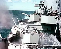 - ↑ Par la comparaison, en plus du démontage de quatre des dix canons de 5 pouces, il faut aussi retirer les canons antiaériens de 20 mm Oerlikon et 40 mm Bofors sur l'USS Iowa, l'USS Missouri et l'USS Wisconsin.