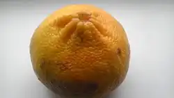 Le fruit est obovoïde, aplati à la base, pointu au sommet d'un diamètre de 12 à 15 cm et d'une hauteur de 9 à 12 cm. La pulpe orange lumineux, juteuse est divisée en douze segments avec des membranes dures mais faciles à séparer, peu ou pas de pépins[12]. Il est bouffi, bosselé, facile à peler, l'albedo est très aéré.