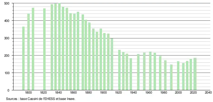 L'évolution du nombre d'habitants est connue à travers les recensements de la population effectués dans la commune depuis 1793. Pour les communes de moins de 10 000 habitants, une enquête de recensement portant sur toute la population est réalisée tous les cinq ans, les populations de référence des années intermédiaires étant quant à elles estimées par interpolation ou extrapolation[29]. Pour la commune, le premier recensement exhaustif entrant dans le cadre du nouveau dispositif a été réalisé en 2006[30].