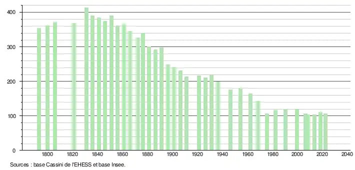L'évolution du nombre d'habitants est connue à travers les recensements de la population effectués dans la commune depuis 1793. Pour les communes de moins de 10 000 habitants, une enquête de recensement portant sur toute la population est réalisée tous les cinq ans, les populations de référence des années intermédiaires étant quant à elles estimées par interpolation ou extrapolation[21]. Pour la commune, le premier recensement exhaustif entrant dans le cadre du nouveau dispositif a été réalisé en 2008[22].
