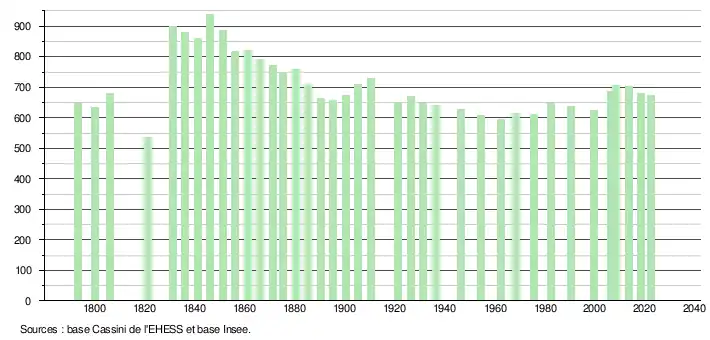 L'évolution du nombre d'habitants est connue à travers les recensements de la population effectués dans la commune depuis 1793. Pour les communes de moins de 10 000 habitants, une enquête de recensement portant sur toute la population est réalisée tous les cinq ans, les populations de référence des années intermédiaires étant quant à elles estimées par interpolation ou extrapolation[21]. Pour la commune, le premier recensement exhaustif entrant dans le cadre du nouveau dispositif a été réalisé en 2008[22].