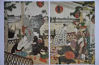 - Diptyques de Kiyonaga montrant des groupes de courtisanes avec leurs clients prenant l'air sur la terrasse des maisons vertes, surplombant d'admirables paysages[38], etc. ;