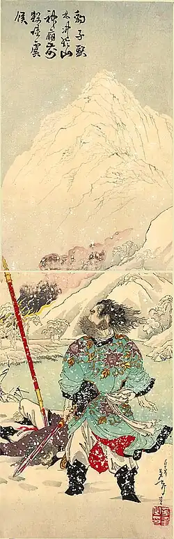 La figure dominante de l'estampe japonaise pendant l'ère Meiji est sans doute Yoshitoshi, élève de Kuniyoshi, et considéré par beaucoup comme le dernier grand artiste d'estampe ukiyo-e[51]. Son style bien reconnaissable, à la fois fin, précis et empreint d'une atmosphère fantastique, n'est pas indigne de ses grands prédécesseurs. Ses estampes recourent pour leur impression à des techniques raffinées telles que le shōmen zuri (impression à l'envers, à sec), qui produit un effet de lustrage du papier et permet par exemple d'imiter la texture de la soie[52].