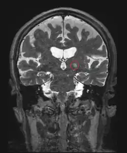 La destruction ou la section de certaines petites structures cérébrales par chirurgie stéréotaxique permet d'améliorer certaines maladies neurologiques. Les HIFU, guidées par imagerie par résonance magnétique[21] semblent être une alternative moins lourdes et ont été testées dans plusieurs maladies : douleurs neuropathiques (section du thalamus centrolatéral[22]), tremblements essentiels (thalamus[23],[24]) et maladie de Parkinson (faisceau pallidothalamique (en) [25].) La technique non invasive concurrente reste la radiochirurgie où la lésion est obtenue par un rayonnement radio-actif.