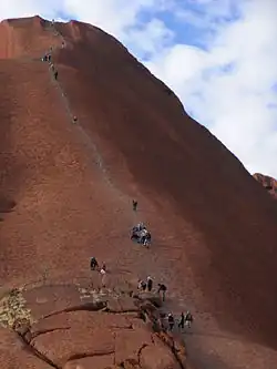 Jusqu'à son interdiction en , l'ascension d'Uluru/Ayers Rock est une attraction populaire. Elle suit alors un parcours de 1,6 kilomètre. La montée est longue (plus d'une heure de grimpe) et peu aisée car la pente varie de 30 à 60 degrés à certains endroits, les conditions climatiques peuvent être difficiles et la roche glissante. La main courante, une chaîne ajoutée en 1964 et rallongée en 1976, indispensable par endroits, permet une ascension plus aisée. Mais les accidents, parfois mortels (35 décès connus au total[12]), sont nombreux. Les vents peuvent être violents et la température atteindre 45 °C l'été[42]. Au sommet du rocher, extrêmement venteux, se trouve un repère géodésique et d'orientation qui permet d'identifier les montagnes environnantes jusqu’à 157 kilomètres de distance.