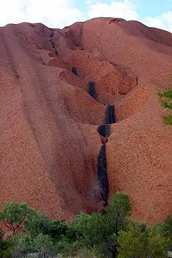 Une caractéristique d'Uluru/Ayers Rock est son homogénéité pétrographique et une quasi-absence de diaclases en surface, ce qui a pour conséquence une quasi-absence d'éboulis sur les pentes et à la base du relief. Ces particularités ont permis sa pérennité, alors que les roches environnantes étaient aplanies[9]. L'étude des relations entre le relief en inselbergs — Uluru/Ayers Rock et les Kata Tjuta/monts Olga — et les dépôts lacustres d'âge Paléocène de la plaine, lors de climats plus humides, montre que ces reliefs relictuels ont pratiquement conservé les mêmes contours et le même aspect depuis 60 millions d'années et que la surface d'aplanissement qu'ils dominent est sans doute plus ancienne[10],[11].