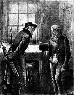 Femme de ménage et laveuse négociant les effets de Scrooge après son décès annoncé, par Fred Barnard.