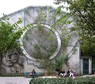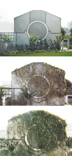 Le mur pignon étant très accessible aux dégradations, plutôt que vers une fresque, l'artiste s’est orienté vers un projet en treillage et végétation qui écarte les velléités de graffitis[4].