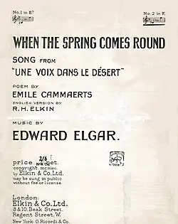 « It is night when the curtain rises, showing the battered dwelling, standing alone in the desolate land, with the twinkling of camp fires along the Yser in the distance, and in the foreground the cloaked figure of a man, who soliloquises on the spectacle to Elgar's music. Then he ceases, and the voice of a peasant girl is heard coming from the cottage, singing a song of hope and trust in anticipation of the day the war shall be ended ["Quand nos bourgeons se rouvriront" ("When the spring comes round again")]... The wayfarer stands transfixed as he listens to the girl's brave song, and then, as he comments again on her splendid courage and unconquerable soul, the curtain slowly falls. »