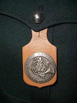 - Cor de chasse brodé en canetille argentée cousu sur le col de la vareuse droite "vert forestier" (vestiaire A) de l'Office national des forêts en 2006.