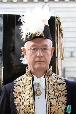 - d'un bicorne à plumes d'autruche (blanches pour les ambassadeurs et ministres plénipotentiaires, noires sinon) ;
