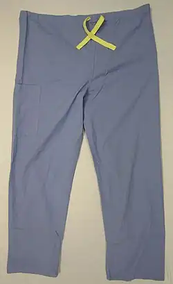 Dans le monde anglophone, cet uniforme était à l'origine connu sous le nom de « surgical greens » (litt. « verts chirurgicaux ») en raison de sa couleur, puis a été appelé « scrubs » parce qu'il était porté dans un environnement « scrubbed » (lavé).