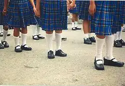 - une jupe plissée noire ou bleu marine pour les filles, parfois avec des bretelles ;