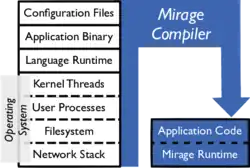 MirageOS[18],[19] est un système d'exploitation bibliothèque qui permet de créer des unikernels pour des applications réseau à haute performance sécurisées sur une grande variété de plateformes mobiles ou dans le nuage. Il existe actuellement plus de cent bibliothèques MirageOS[20] et un nombre croissant de bibliothèques compatibles dans l'écosystème OCaml.