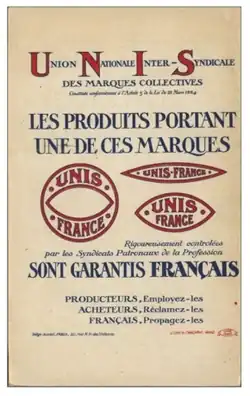Le 9 décembre 1915[réf. nécessaire], des industriels, fabricants, commerçants et syndicats français décident de se regrouper pour défendre leurs produits fabriqués en France contre ceux importés d'Allemagne, généralement en marque blanche. Ils fondent alors l'association « Unis-France », c'est-à-dire Union nationale Inter-Syndicale des marques collectives avec leur marque commerciale collective Unis-France, déposée en 1916[1].
