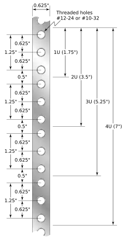 Le type de filetage[3] employé peut varier en fonction de la baie. Ceux-ci peuvent être taraudés 10-32 (filetage unifié standard), taraudés 12-24 ou présenter des inserts universels appelés « trous carrés ». L'utilisation des trous carrés universels est de plus en plus commun et permet l'insertion d'écrous cage remplaçables en fonction du type de filetage nécessaire, ce qui permet plus de flexibilité.