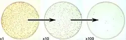 - Les méthodes de Miles et Misra (ou méthode de dépôt sur plaque) où un très petit aliquot (généralement environ 10 microlitres) d'échantillon de chaque dilution en série est déposé sur une boîte de Petri. La gélose doit être lue pendant que les colonies sont très petites pour éviter la perte d'UFC lors de leur croissance[10].