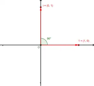 Enfin, dans un plan muni d'un repère orthonormé (O, U, V), on peut associer l'ensemble des complexes à l'ensemble des vecteurs du plan muni de l'addition usuelle et d'une multiplication plus sophistiquée :
