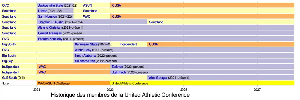 - La United Athletic Conference a été officielle dès la saison 2023. L'année d'adhésion reflète le moment où le programme a rejoint l'UAC ou le championnat WAC-ASUN (organisés en 2021 et 2022 - voir la rubrique histoire.)