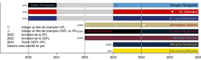 - ↑ (en-US) « Merged XFL-USFL rebrands as UFL, sets opener », sur ESPN.com, (consulté le ).