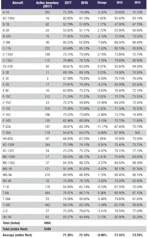 Les perspectives sont extrêmement inquiétantes, puisque le GAO prévoit qu'en 2020, dans les conditions de projection des commandes d'avions de combat F-22 qui s'est arrêté à 187 appareils de série et F-35 fin 2008, onze des dix-huit « sites de mission ASA » pourraient n'avoir aucun avion à leur disposition. Le GAO fait un pronostic des restrictions considérables des capacités de combat aérien de l'USAF sur les quinze ans, compte tenu de la programmation projetée par l'USAF. En 2008, il y avait, selon le GAO, 2 325 avions de combat capables d'accomplir leurs missions (dont une part avec des restrictions). Compte tenu de l'arrivée actuellement programmée de nouveaux avions et du départ d'avions trop vieux pour continuer à voler, le chiffre tombera à 1 175en 2020 et à 1 100 en 2025[15].
