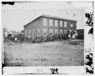 Les maisons du soldat - La Commission demanda, puis prit en main elle-même l'aménagement, à côté de la gare de Washington, d'une « maison du soldat » capable d'accueillir les laissés pour compte qui, n'ayant pas résisté au premières marches et au transport, étaient abandonnés par leurs régiments en route pour de nouveaux cantonnements ou pour le front. D'abord improvisée sous la houlette de Frederick N. Knapp, cette branche se structura rapidement[24]. Elle prenait en charge les malades délaissés dont l'état ne justifiait pas l'admission dans un hôpital général et ceux qui, récemment renvoyés à la vie civile, s'attardaient en ville pour conclure des démarches administratives. Elle les assista pour compléter leurs dossiers, les défendit en cas de litige avec l'armée, finança le retour au foyer des plus démunis, les rendit présentables et s'assura, jusque sur le quai de la gare, qu'ils ne tombaient pas sous la coupe d'aigrefins. L'initiative fut répliquée dans les grandes villes (Boston, Hartford, New York, Philadelphie, Cleveland, Cincinnati, Cairo, Chicago), et aux points de ralliement correspondant aux nœuds ferroviaires (Louisville, Nashville[note 24], Memphis, New Orleans, Brownsville, Port Royal). Au total, quarante « maisons du soldat » furent mises sur pied. Elles avaient une capacité totale d'accueil de 2 300 lits et assurèrent quatre millions et demi de repas et plus d'un million de nuits d'hébergement. Leurs agents aidèrent les soldats à récupérer près de deux millions et demi de $ qui leur étaient dus.