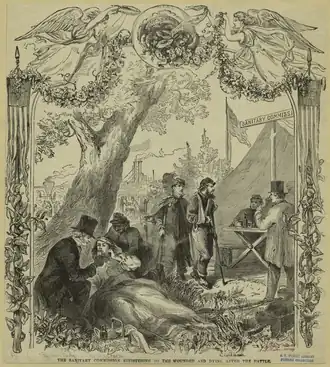 C'est dans ce contexte que fut également créée, à New-York, à la fin du mois d'avril et à l'initiative du Dr Elizabeth Blackwell (première femme à recevoir un diplôme de médecine sur le territoire des États-Unis), la Women's Central Association of Relief[2], l'association féminine qui allait tout à la fois donner naissance à la U.S. Sanitary Commission et être un de ses principaux auxiliaires tout au long du conflit. Répondant à l'appel signé par « quatre-vingt-douze dames parmi les plus connues et les plus influentes de New York », de très nombreuses femmes se mirent au service de l'association, dont la direction fut confiée, signe des temps, à un bureau et à un exécutif exclusivement masculins[3],[4],[5].