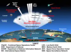 - en orbite basse : les satellites du Space Based Space Surveillance (SBSS) chargés de surveiller l'orbite basse et de l' Advanced Technology Risk Reduction System (ATRR) ayant pour but de surveiller l'orbite géostationnaire depuis l'orbite basse;