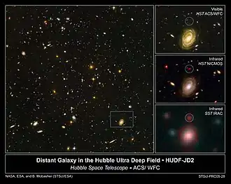 - la galaxie z8 GND 5296, dont la découverte a été annoncée le 23 octobre 2013, formée environ 700 millions d'années après le Big Bang[22],[23] ;