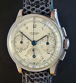 Les chronographes Universal ont en grande partie fait la réputation de l'entreprise, la marque "Compax" étant d'ailleurs devenue générique pour désigner un cadran chronographe 3 compteurs. La spécialisation d'Universal dans le chronographe a véritablement commencé à partir de 1934 et s'est poursuivie avec le lancement de nombreux modèles, les principaux étant les suivants :