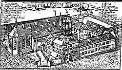 On retient généralement l'année 1558 comme celle de la fondation officielle de l’université d'Iéna. On l'appelait alors Salana ou Collegium Jenense[1] ; mais dès 1547, le prince-électeur Jean-Frédéric de Saxe, qui s'opposait à l'empereur Charles Quint et venait de se voir confisquer et la dignité d'électeur, et l’université de Wittemberg (confiée au duc Maurice), avait envisagé de créer sa propre université. Ce projet fut poursuivi par ses trois fils : le , ils fondèrent dans l'ancien monastère dominicain de la petite ville de vignobles d'Iéna, une « école régionale » (Pædagogium provinciale). Par un décret du du Roi des Romains (et futur empereur) Ferdinand Ier, ces princes obtenaient l'autorisation de créer une université : celle-ci put ouvrir ses portes le [2]. La création de cette université en terre protestante allait permettre aux princes ernestins de tirer les bénéfices de l'Intérim d'Augsbourg, en assurant la formation de juristes, de professeurs et surtout de pasteurs.