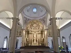 De part et d’autre du maître-autel ont été apposés quatre balcons réalisés en bois et en stuc, peints dans une teinte dorée, dont la balustrade prend une forme légèrement concave sur la partie centrale et convexe aux extrémités. Du garde-corps surgissent quatre colonnes torses supportant un entablement et délimitant trois travées, dont la plus grande, celle du milieu, est couronnée d’un somptueux fronton à volutes[15].
