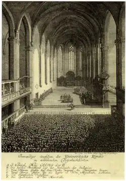 Mais la visite du roi George II à Göttingen, le , avait déjà été en soi un événement pour cette petite ville du Hanovre. Les festivités tenues dans l'église Saint-Paul ont été commémorées par une gravure (cf. planche ci-contre) et le récit qu'en a donné Johann Lorenz von Mosheim. De telles visites princières, à l'occasion même celles de membres de la dynastie régnante : celle du duc d’York en 1765, du Prince Ferdinand de Brunswick en 1768 ou du duc de Gloucester en 1769, constituaient pour les étudiants et le corps professoral des événements appréciés. Les Comitaten des confréries estudiantines de Nörten ou du quartier de Weende y participaient activement ; les membres de maisons guelfes étaient accueillis aux portes de l'université par une garde d'honneur formée de compatriotes du Hanovre et du Brunswick, annoncés („eingeholt“) et à la fin de leur séjour, raccompagnés.