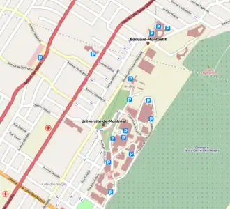 Le pavillon Roger-Gaudry de l'Université de Montréal, l'édifice Côte-Sainte-Catherine d'HEC Montréal et le pavillon principal de Polytechnique Montréal.