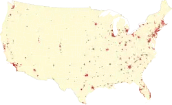 La conurbation du Grand Los Angeles, qui regroupe plus de 171 municipalités, avait en 2005 une population estimée à plus de 17 millions d'habitants, répartis sur une surface totale de 87 972 km², dont seulement la moitié est densément peuplée[13]. Dans les trente dernières années, des edge cities, ou « villes-lisières », concurrencent les centres-villes, en participant à la polynucléarisation des centres urbains (la Silicon Valley ou Princeton, près de New York, fournissant des exemples de telles villes).