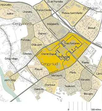 Le point de départ de la ville nouvelle est le quartier de la préfecture qui constitue le centre-ville de Cergy-Pontoise et qui est traité en dalle.
