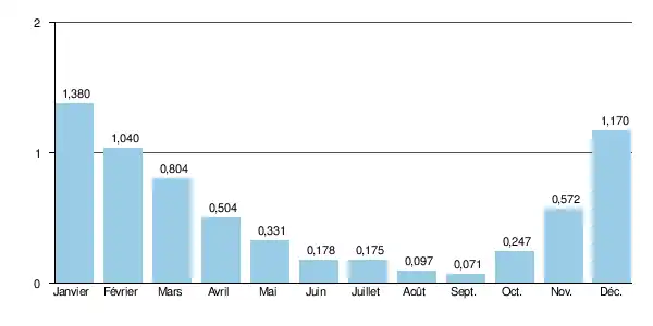 Sur cette période d'observation, le débit journalier maximal a été observé le pour 13,60 m3/s. Le débit instantané maximal a été observé le [note 3] avec 16,20 m3/s en même temps que la hauteur maximale instantanée de 1 760 mm soit 1,760 m[2].