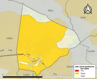 Près de 50 % de la superficie du département est concernée par l'aléa retrait-gonflement des argiles, dont la commune d'Urs[38]. L'inventaire national des cavités souterraines permet par ailleurs de localiser celles situées sur la commune[39].