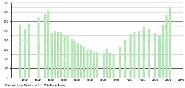 L'évolution du nombre d'habitants est connue à travers les recensements de la population effectués dans la commune depuis 1793. Pour les communes de moins de 10 000 habitants, une enquête de recensement portant sur toute la population est réalisée tous les cinq ans, les populations de référence des années intermédiaires étant quant à elles estimées par interpolation ou extrapolation[26]. Pour la commune, le premier recensement exhaustif entrant dans le cadre du nouveau dispositif a été réalisé en 2007[27].