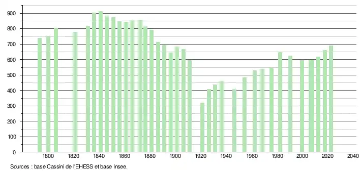 L'évolution du nombre d'habitants est connue à travers les recensements de la population effectués dans la commune depuis 1793. Pour les communes de moins de 10 000 habitants, une enquête de recensement portant sur toute la population est réalisée tous les cinq ans, les populations de référence des années intermédiaires étant quant à elles estimées par interpolation ou extrapolation[18]. Pour la commune, le premier recensement exhaustif entrant dans le cadre du nouveau dispositif a été réalisé en 2007[19].