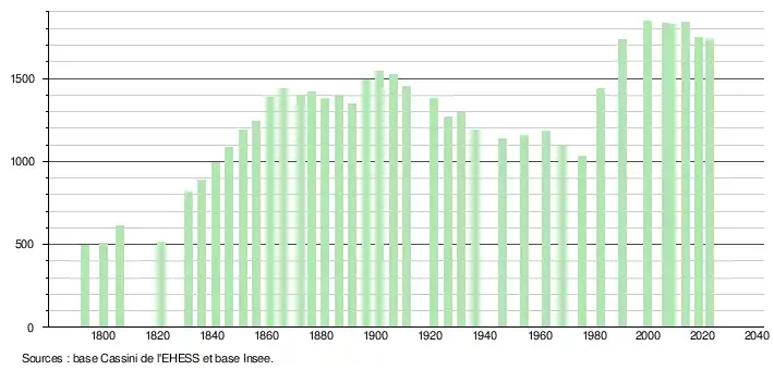 L'évolution du nombre d'habitants est connue à travers les recensements de la population effectués dans la commune depuis 1793. Pour les communes de moins de 10 000 habitants, une enquête de recensement portant sur toute la population est réalisée tous les cinq ans, les populations de référence des années intermédiaires étant quant à elles estimées par interpolation ou extrapolation[13]. Pour la commune, le premier recensement exhaustif entrant dans le cadre du nouveau dispositif a été réalisé en 2008[14].